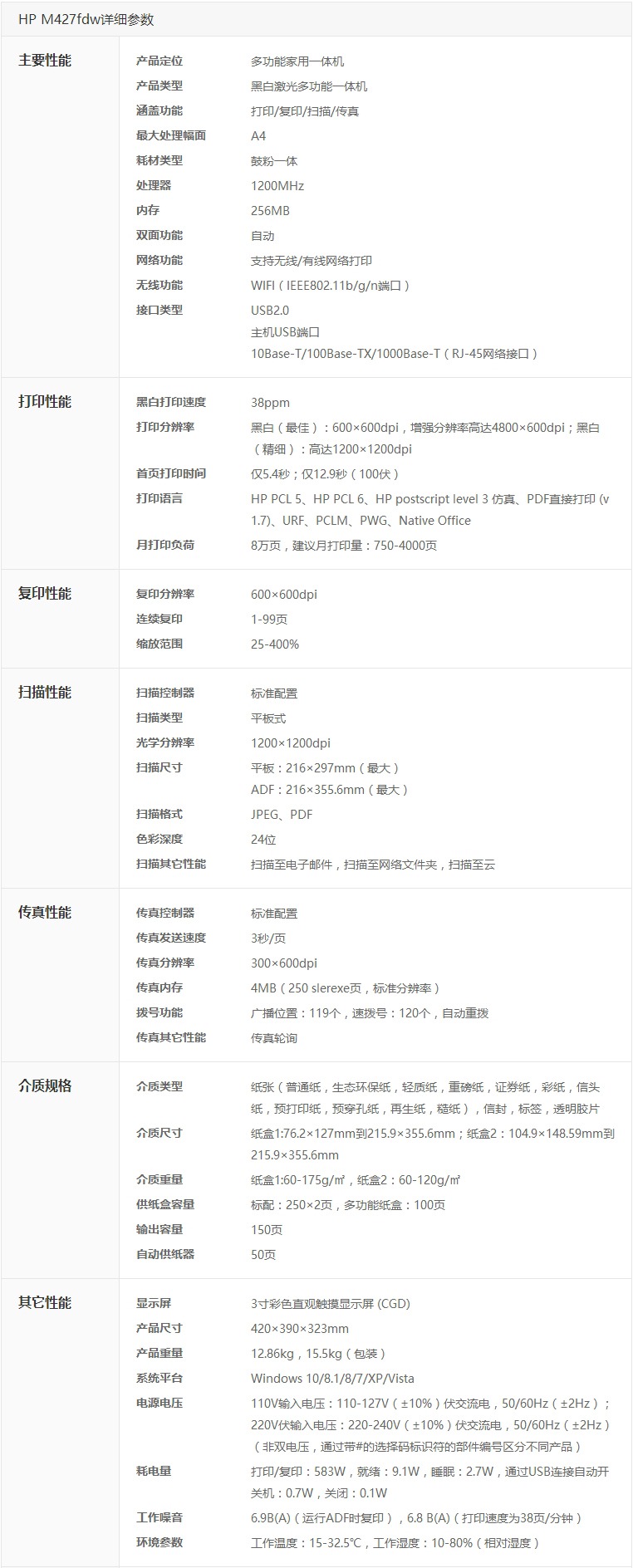 惠普(hp)MFPM427fdw激光多功能一体机(无线打印复印扫描