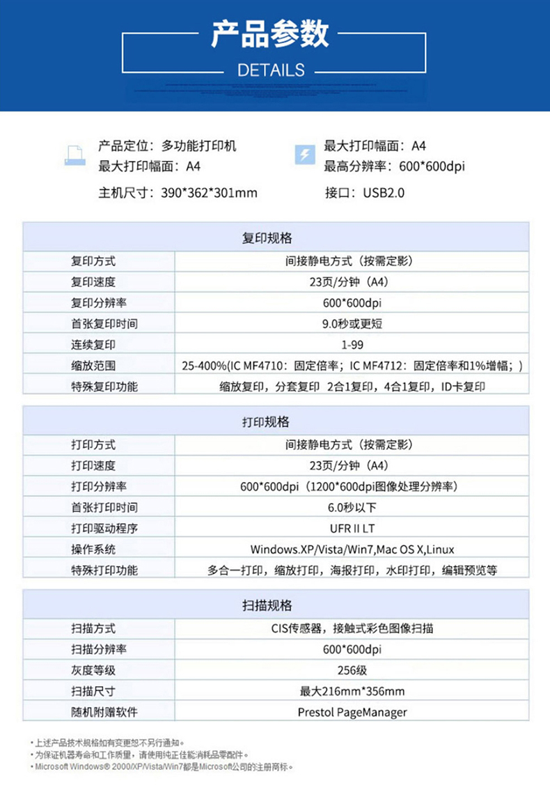 佳能(Canon)iCMF4712黑白激光多功能一体机 A4 打印/复印/扫描 不支持网络打印 23页/分钟 手动双面打印 (imageCLASS mF4712)适用耗材:CRG-328 一年保修