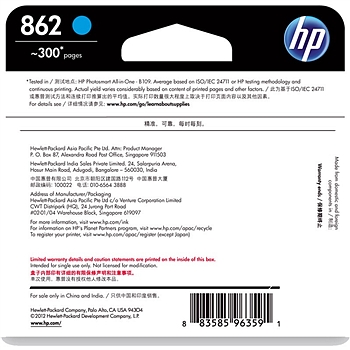 惠普HP862青色墨盒CB318ZZ适用于:HPPhotosmartC5388/C5468/C8558/C309A/C309G/C310A/C410d/B209A/B210A/B110/5510/6510/7510
